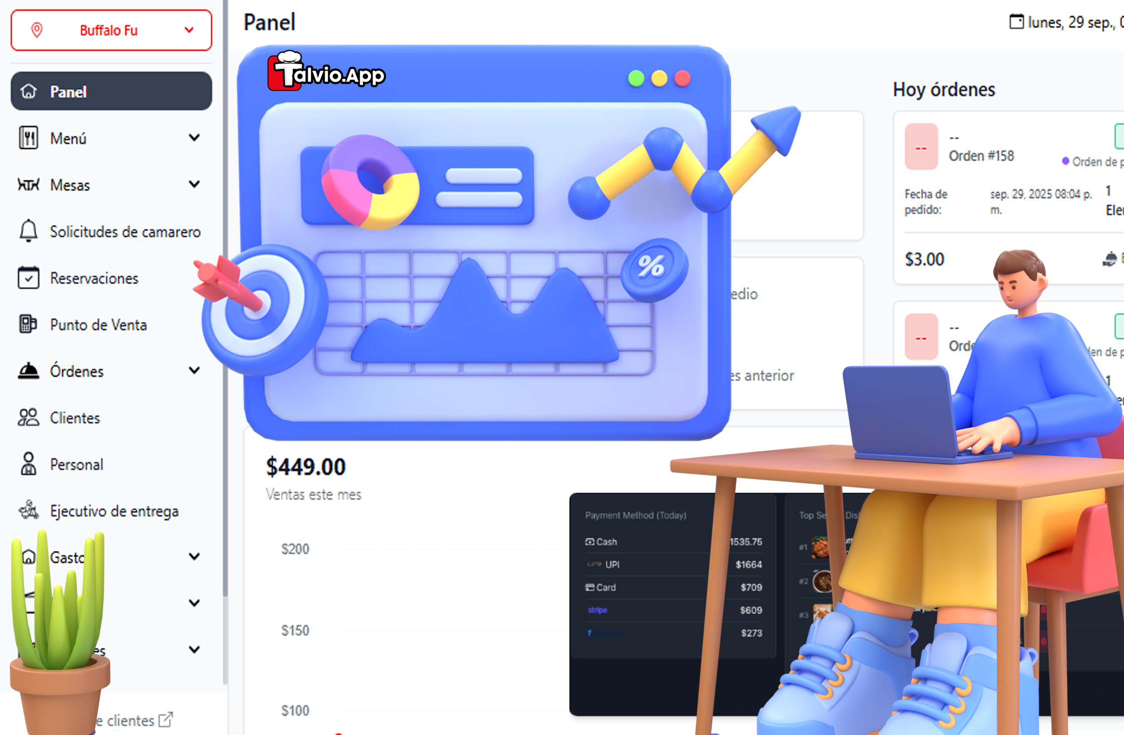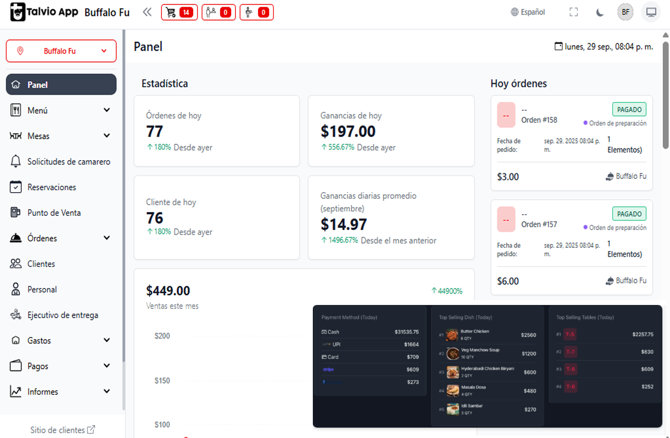 Talvio App te da POS, inventario, reportes y precios reales por plato. Además, obtén tu propio menú online de delivery GRATIS por cada cuenta.